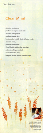 Attached to cleaness, you have made your mind dirty. Attached to brightness, you have made it dark. Seeking mind outside deceived by the words 'transmit mind', you have made a form. Clear Mind is neither clear nor dirty, and neither bright nor dark. It can't be said to exist, but great ancient masters passed it down.