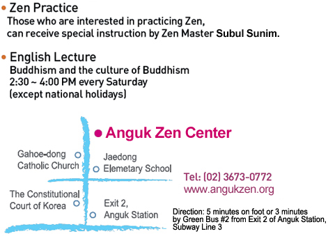 veryday about 3,000 members of Anguk Zen Center practice Zen in the Seoul and the Busan centers. Members can choose any of the available sessions which are held three times a day: dawn, morning and afternoon. Most members especially participate in the winter and summer retreats.